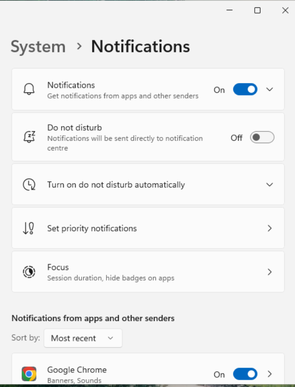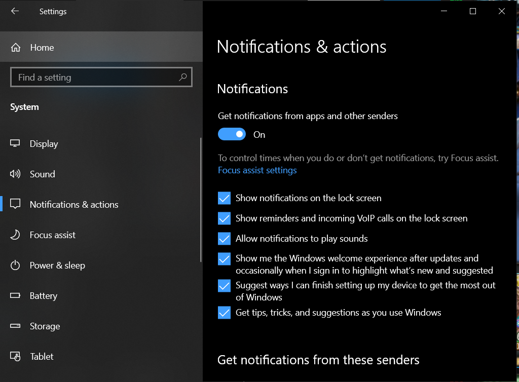 Click on the ‘Notifications and actions’ tab and make sure all checkboxes are ticked. This includes your main browser’s notification settings